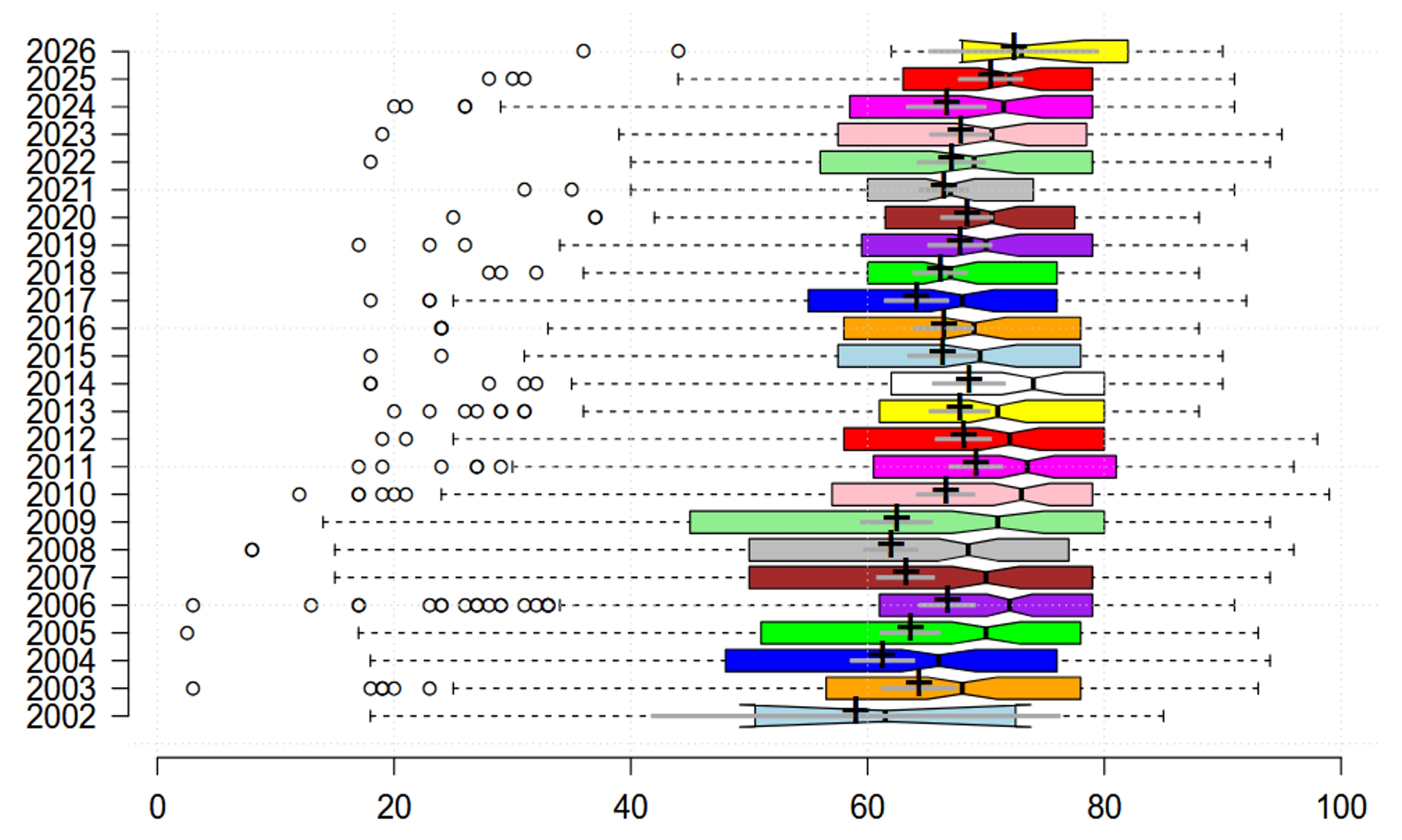 | 2009 | 58 | 28.57 | 2017 | 44 | 29.70 | 2025 | 39 | 28.47 |