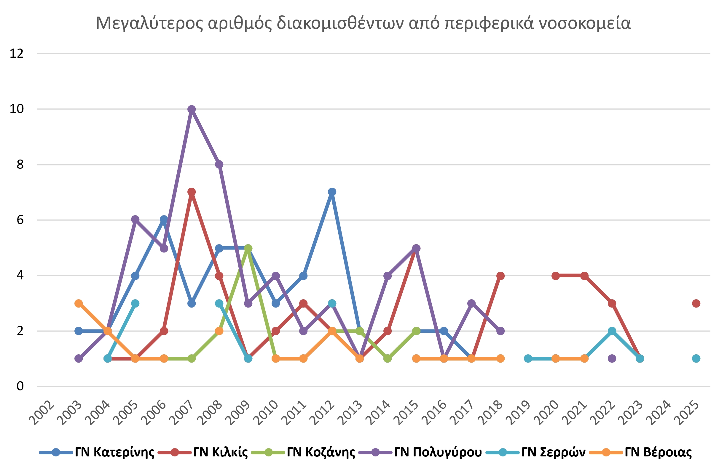 Ελάχιστα περιστατικά από αυτά (3,1% ή 35/1131) προήλθαν από ιδιωτικές κλινικές, κυρίως της Θεσσαλονίκης, με τα περισσότερα να προέρχονται από τις μεγάλες κλινικές όπως το Ιατρικό Διαβαλκανικό Θεσ/νίκης και τη κλινική «Άγιος Λουκάς», ενώ μόνο δύο περιστατικά διακομίστηκαν από στρατιωτικό νοσοκομείο (424 Γενικό Στρατιωτικό Νοσοκομείο Θεσ/νίκης). Στα γραφήματα 2 και 3 βλέπουμε τους ασθενείς που προήλθαν από τα τέσσερα μεγάλα νοσοκομεία της Θεσσαλονίκης ανά έτος και τους ασθενείς που προήλθαν από περιφερικά νοσοκομεία που είχαν και το μεγαλύτερο αριθμό διακομισθέντων ασθενών στη ΜΕΘ.